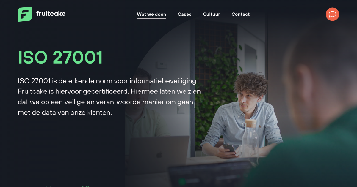 ISO 27001 is de erkende norm voor informatiebeveiliging. Fruitcake is hiervoor gecertificeerd. Hiermee laten we zien dat we op een veilige en verantwoorde manier om gaan met de data van onze klanten.