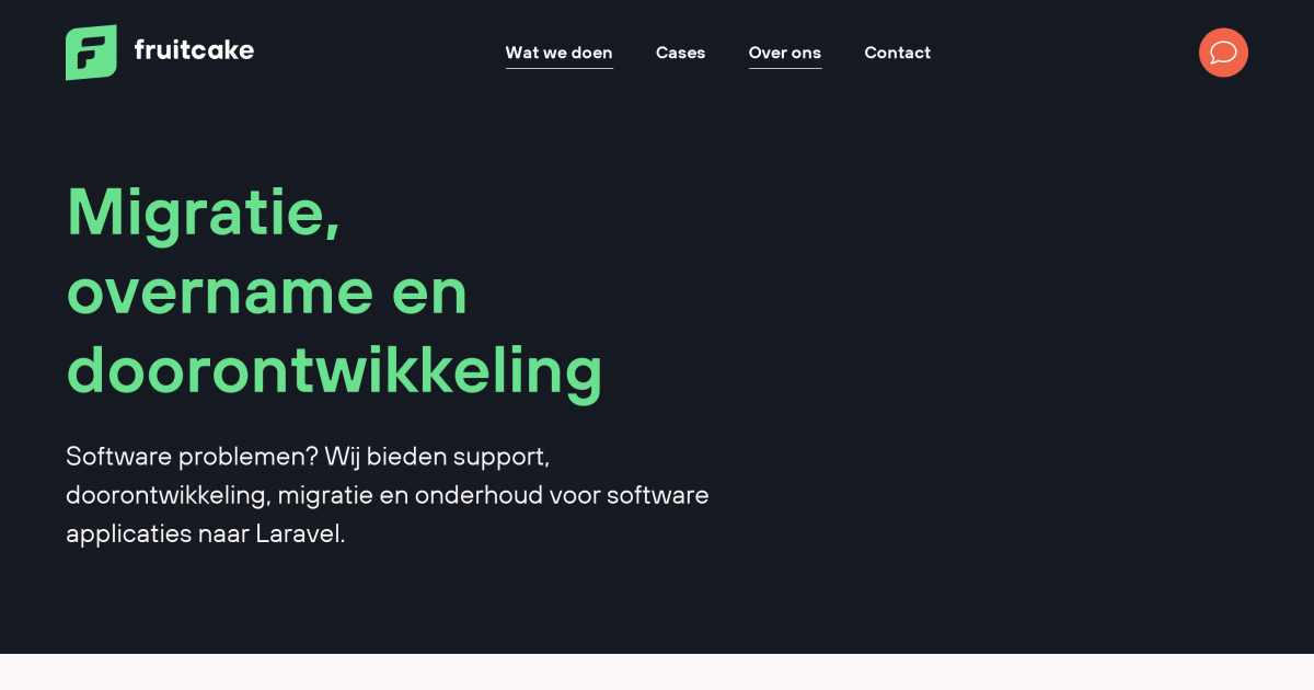 Het bouwen van een applicatie is één ding, maar een applicatie moet langdurig en veilig kunnen draaien zodat jouw organisatie erop kan vertrouwen. Bij Fruitcake ondersteunen we bedrijven bij overnames en onderhoud van softwarepakketten. Ook als jouw huidige applicatie niet in Laravel gebouwd is en je deze graag wilt migreren naar dit framework kunnen wij hier bij helpen.