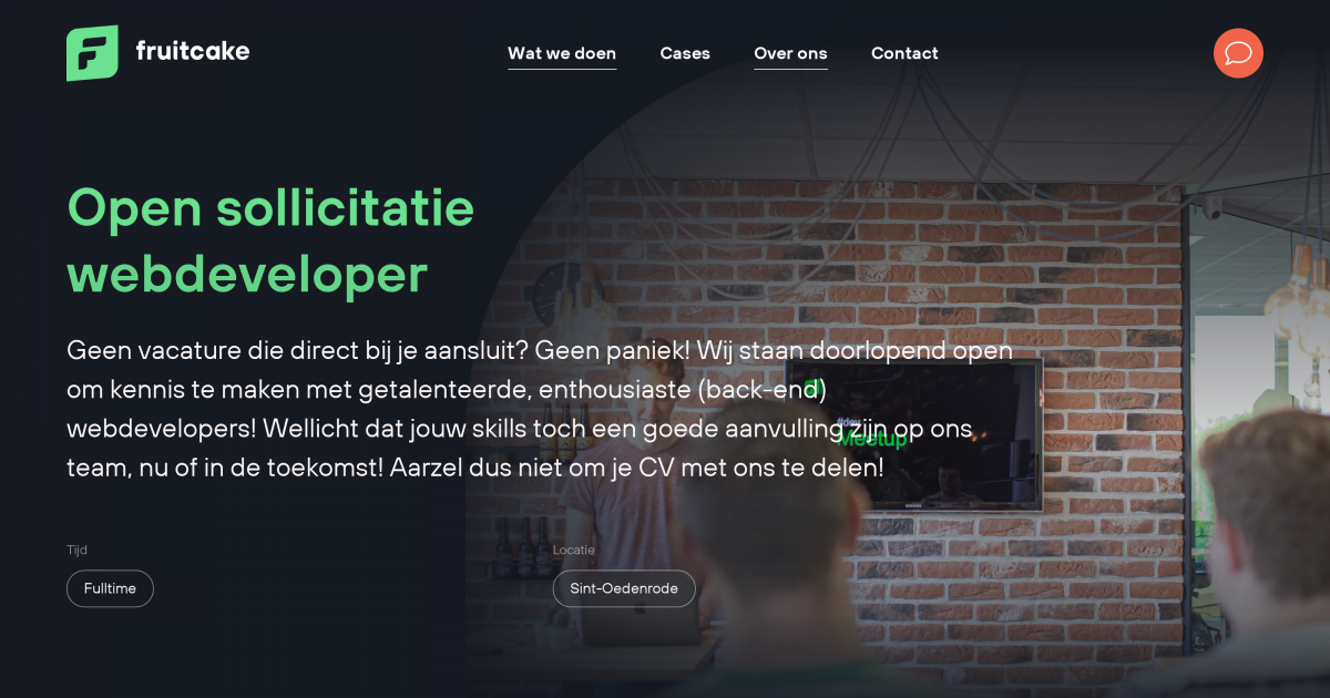 Als back-endwebdeveloper bij Fruitcake ga je aan de slag met de laatste technieken om moderne en vernieuwende webapplicaties te ontwikkelen. Binnen ons team speel je een sleutelrol in uitdagende projecten en zorg je ervoor dat onze producten volledig functioneel, innovatief en flexibel zijn. Je bent enthousiast en multifunctioneel, je denkt graag mee en bent een inspirator voor anderen op het gebied van bleeding-edge technologie. Vanzelfsprekend sta je open voor andere ideeën en beschik je over een drive om continu te leren.