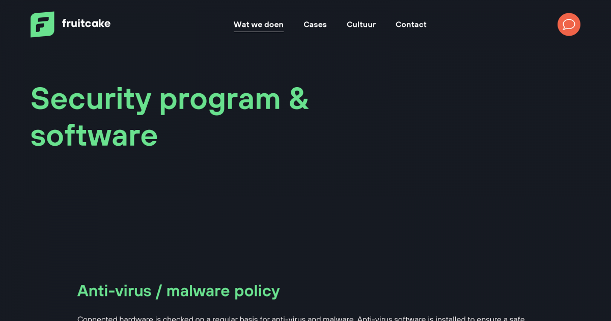 For Laravel projects, a local development server (either a server located inside the office, or a server running on a Fruitcake issued computer) will be used. This will prevent unauthorized access or data loss from any possible break-in. Sensitive data will only be available in the online test- and production environment, never on the (local) development environment.