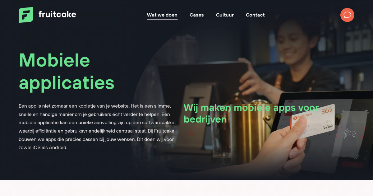 Bij Fruitcake bouwen we mobiele applicaties als natuurlijke aanvulling op jouw maatwerk software systeem. Waarom? Omdat gebruiksgemak essentieel is. Een goed ontworpen app maakt het voor jouw gebruikers eenvoudiger om altijd en overal toegang te krijgen tot de kernfunctionaliteiten van jouw systeem.