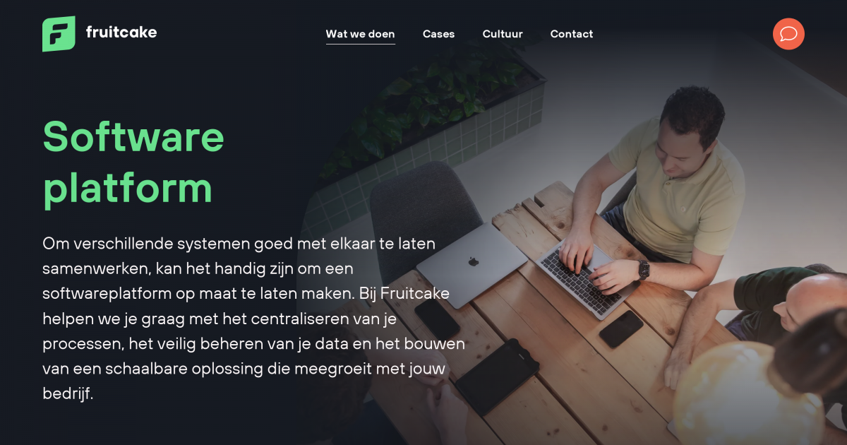 Om verschillende systemen goed met elkaar te laten samenwerken, kan het handig zijn om een softwareplatform op maat te laten maken. Bij Fruitcake helpen we je graag met het centraliseren van je processen, het veilig beheren van je data en het bouwen van een schaalbare oplossing die meegroeit met jouw bedrijf.